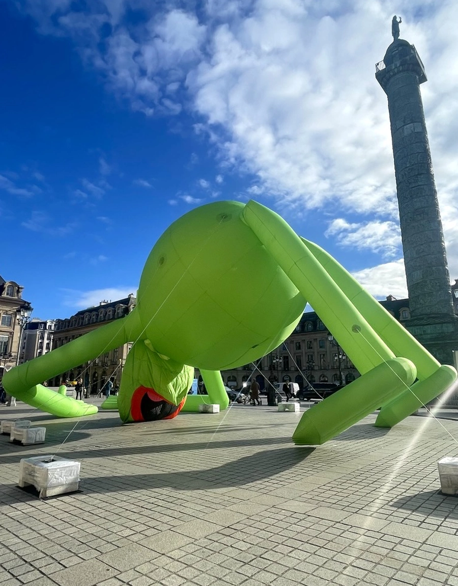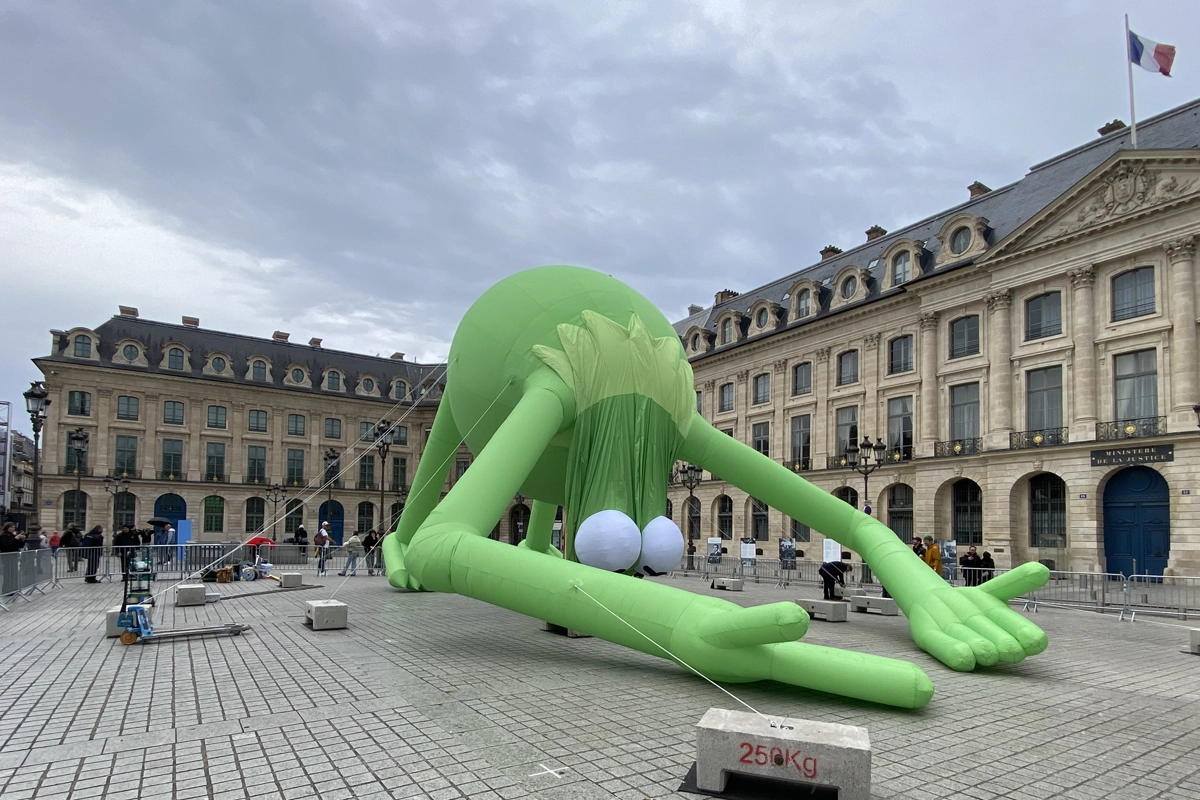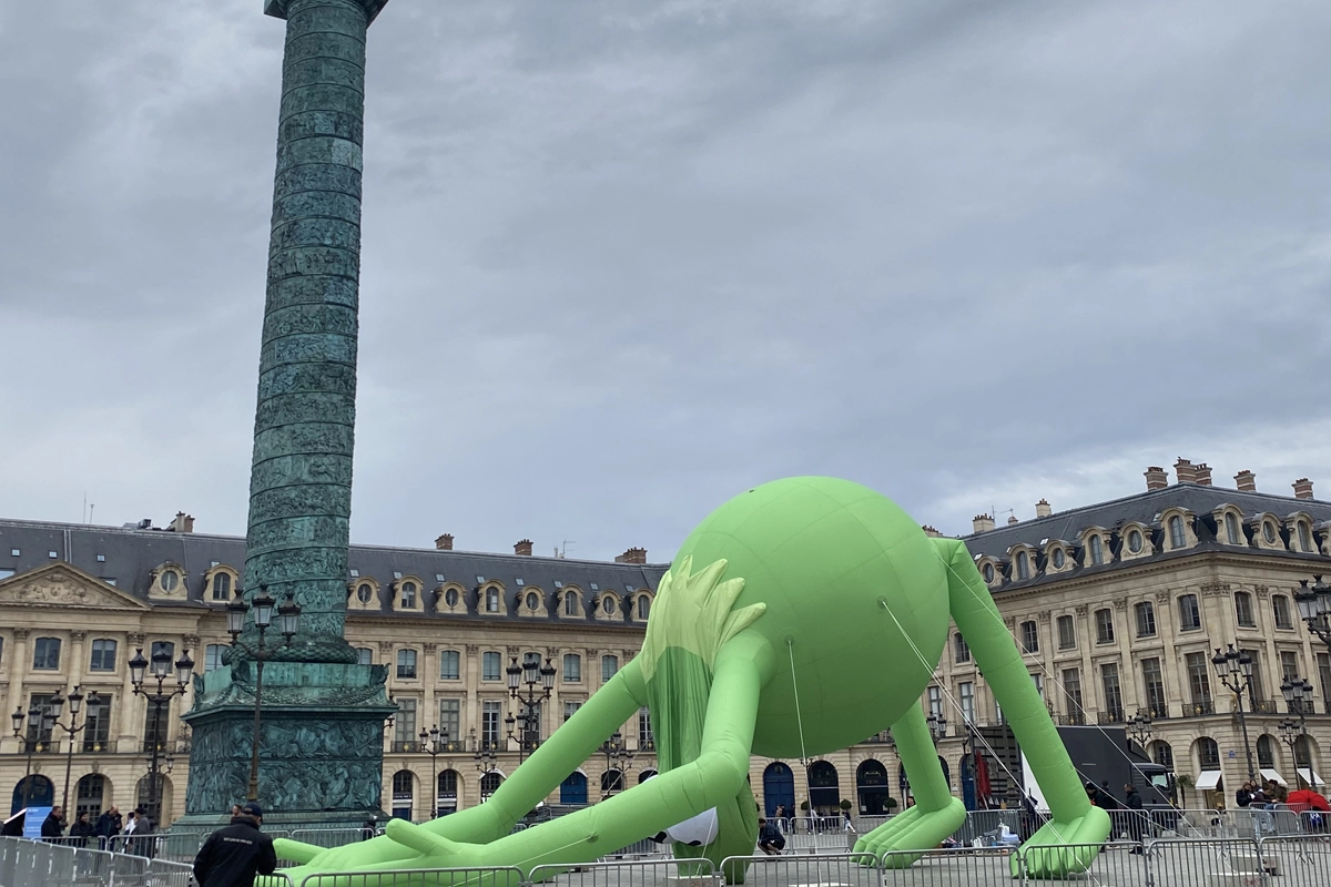 Una gigantesca rana Gustavo de helio, creada por Alex Da Corte, sobrevuela Place Vendôme durante Art Basel Paris. La histórica plaza se convierte en un escenario insólito donde el humor pop y una melancolía silenciosa se dan la mano bajo la figura hinchable de casi 20 metros.