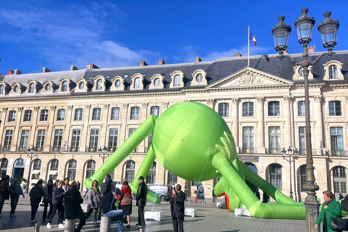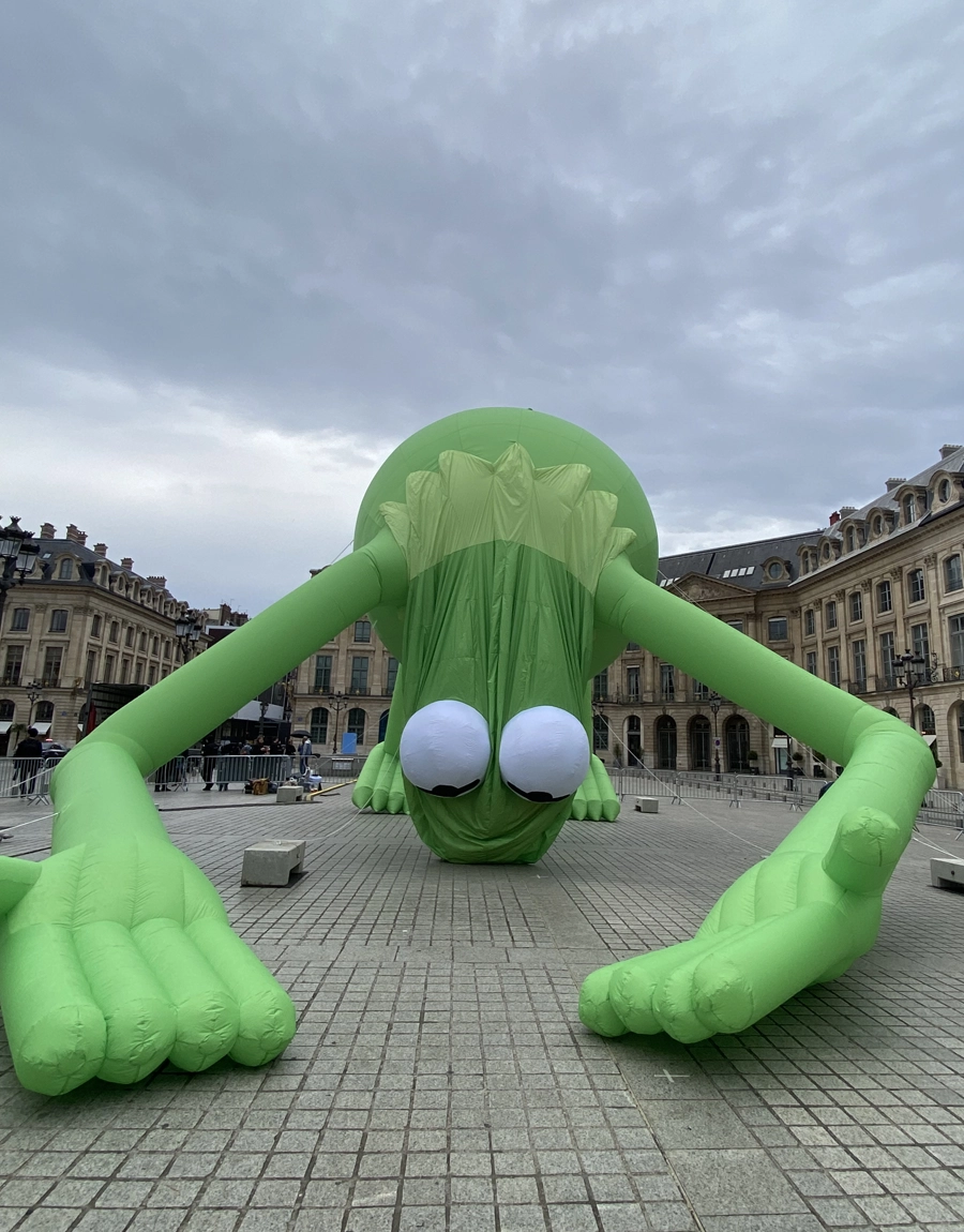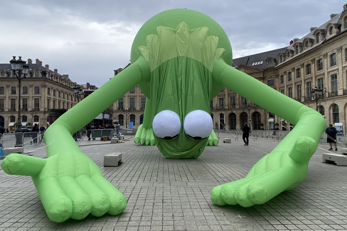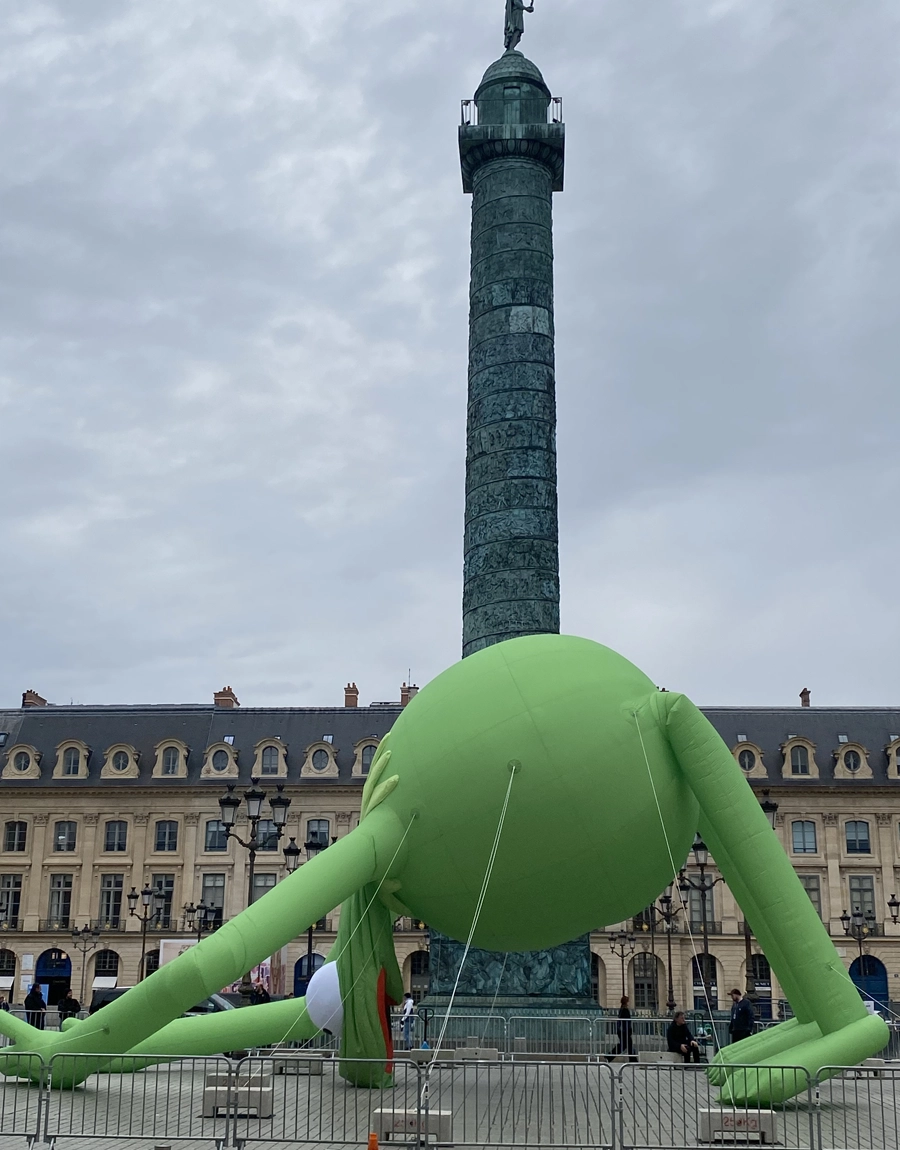Una gigantesca rana Gustavo de helio, creada por Alex Da Corte, sobrevuela Place Vendôme durante Art Basel Paris. La histórica plaza se convierte en un escenario insólito donde el humor pop y una melancolía silenciosa se dan la mano bajo la figura hinchable de casi 20 metros.